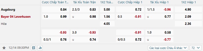 Tip kèo Châu Á full trận Augsburg vs Bayer Leverkusen