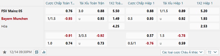 Tip kèo Châu Á hiệp 1 Mainz vs Bayern Munich