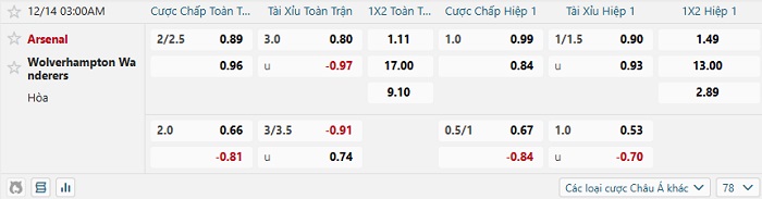 Tip kèo Châu Á full trận Arsenal vs Wolves