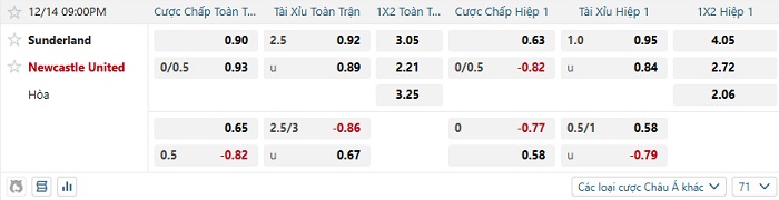 Tip kèo Châu Á full trận Sunderland vs Newcastle