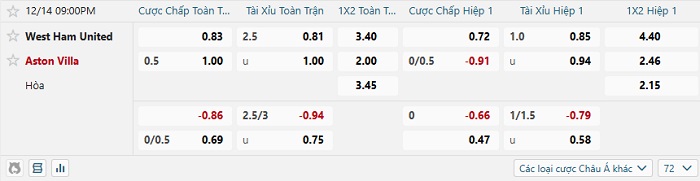 Tip kèo Châu Á full trận West Ham vs Aston Villa