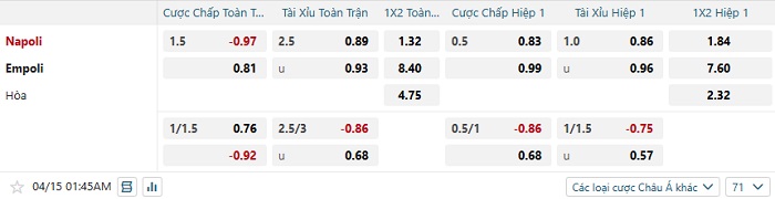 Tip kèo Châu Á full trận Napoli vs Empoli
