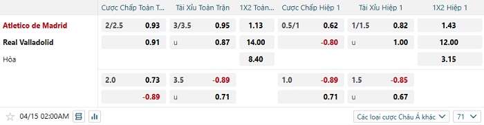 Tip kèo Châu Á hiệp 1 Atletico Madrid vs Valladolid