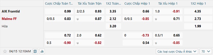 Tip kèo Châu Á hiệp 1 AIK Framtid vs Malmo