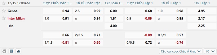 Tip kèo Châu Á hiệp 1 Genoa vs Inter