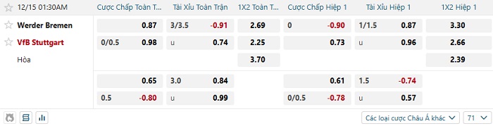 Tip kèo Châu Á full trận Werder Bremen vs Stuttgart