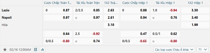 Tip kèo Châu Á hiệp 1 Lazio vs Napoli