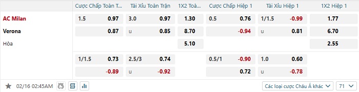 Tip kèo Châu Á hiệp 1 Milan vs Verona