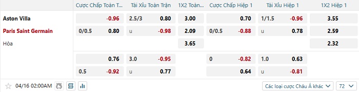 Tip kèo Châu Á full trận Aston Villa vs PSG