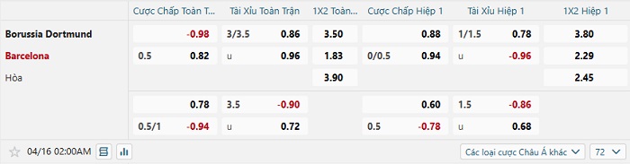 Tip kèo Châu Á full trận Dortmund vs Barcelona