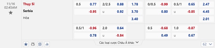 Tip kèo Châu Á hiệp 1 Thụy Sĩ vs Serbia
