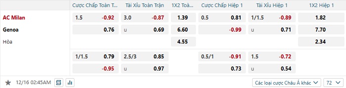 Tip kèo Châu Á full trận Milan vs Genoa