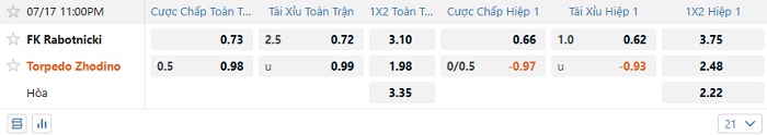 Tip kèo Châu Á full trận Rabotnicki vs Torpedo Zhodino