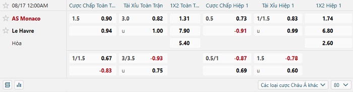 Tip kèo Châu Á hiệp 1 Monaco vs Le Havre
