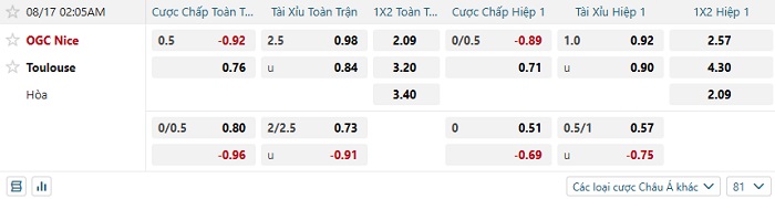 Tip kèo Châu Á full trận Nice vs Toulouse