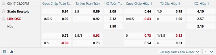 Tip kèo Châu Á full trận Brest vs Lille