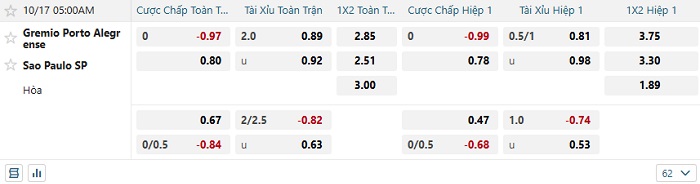 Tip kèo Châu Á full trận Gremio vs Sao Paulo
