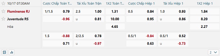 Tip kèo Châu Á hiệp 1 Fluminense vs Juventude