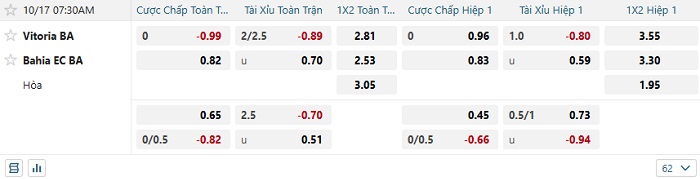 Tip kèo Châu Á hiệp 1 Vitoria vs Bahia