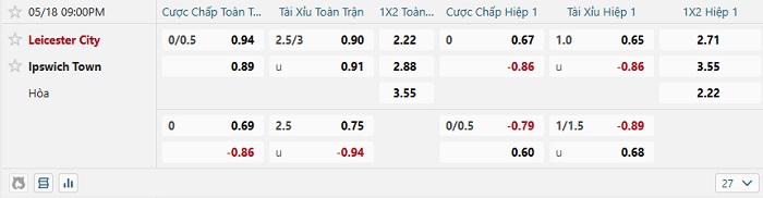 Tip kèo Châu Á hiệp 1 Leicester vs Ipswich