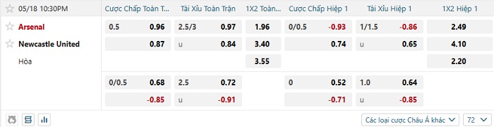Tip kèo Châu Á hiệp 1 Arsenal vs Newcastle