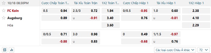 Tip kèo Châu Á hiệp 1 Koln vs Augsburg