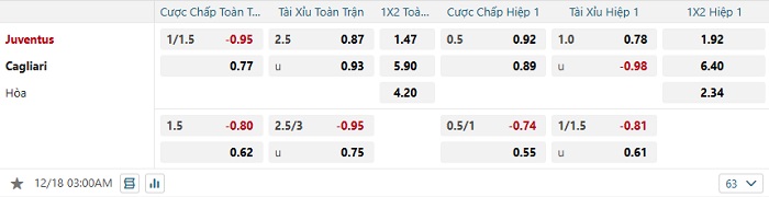 Tip kèo Châu Á hiệp 1 Juventus vs Cagliari
