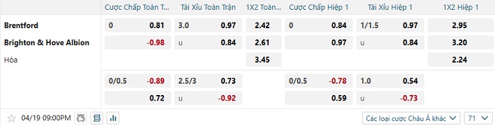 Tip kèo Châu Á hiệp 1 Brentford vs Brighton