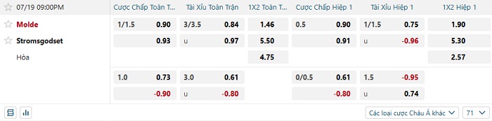 Tip kèo Châu Á hiệp 1 Molde vs Stromsgodset