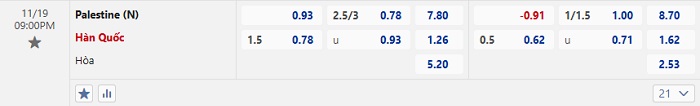 - Dự đoán tỷ số hiệp 1: Palestine 0 – 0 Hàn Quốc