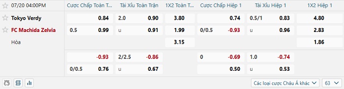 Tip kèo Châu Á full trận Tokyo Verdy vs Machida Zelvia
