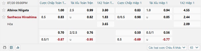 Tip kèo Châu Á hiệp 1 Albirex Niigata vs Sanfrecce Hiroshima