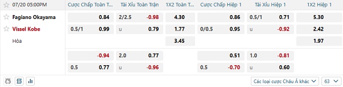 Tip kèo Châu Á hiệp 1 Fagiano Okayama vs Vissel Kobe