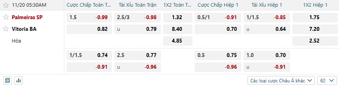 Tip kèo Châu Á hiệp 1 Palmeiras vs Vitoria