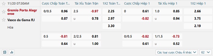 Tip kèo Châu Á hiệp 1 Gremio vs Vasco da Gama