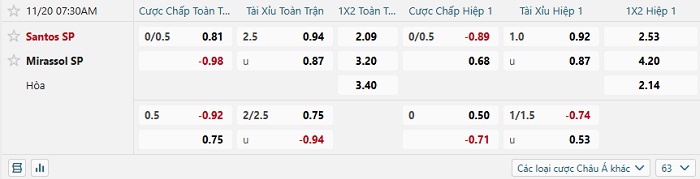 Tip kèo Châu Á full trận Santos vs Mirassol