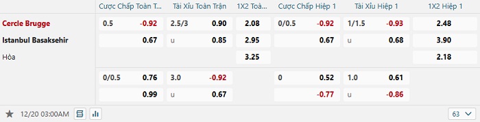 Tip kèo Châu Á hiệp 1 Cercle Brugge vs Basaksehir