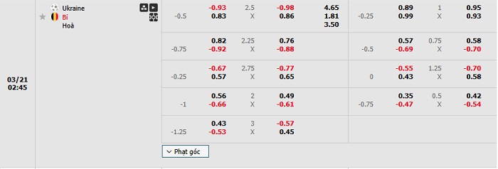 Tip kèo Châu Á hiệp 1 Ukraine vs Bỉ