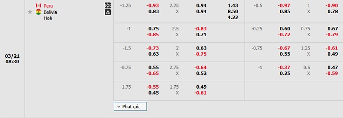Tip kèo Châu Á full trận Peru vs Bolivia