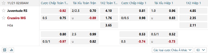 Tip kèo Châu Á full trận Juventude vs Cruzeiro