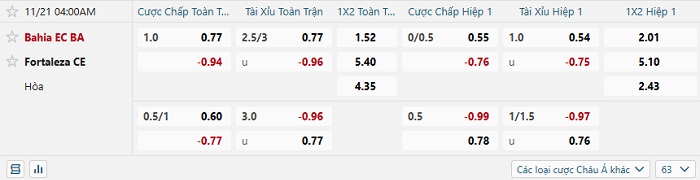 Tip kèo Châu Á full trận Bahia vs Fortaleza