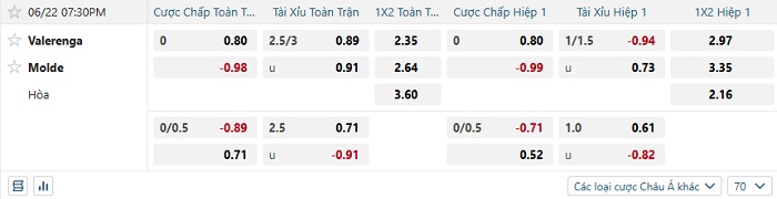Tip kèo Châu Á hiệp 1 Valerenga vs Molde