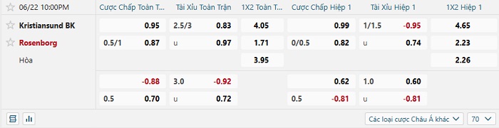 Tip kèo Châu Á full trận Kristiansund vs Rosenborg