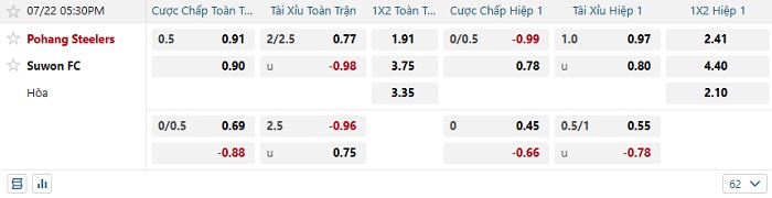 - Dự đoán tỷ số hiệp 1: Pohang Steelers 0 – 0 Suwon