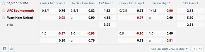 Tip kèo Châu Á full trận Bournemouth vs West Ham