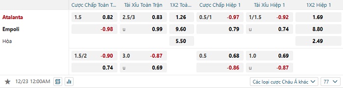 Tip kèo Châu Á hiệp 1 Atalanta vs Empoli