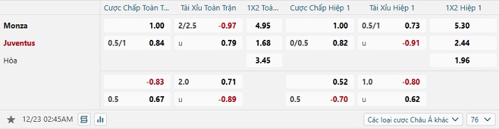 Tip kèo Châu Á hiệp 1 Monza vs Juventus