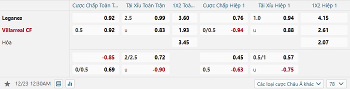 Tip kèo Châu Á full trận Leganes vs Villarreal