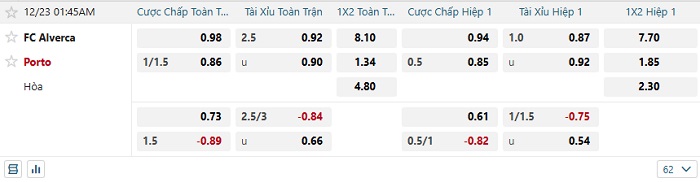 Tip kèo Châu Á hiệp 1 Alverca vs Porto
