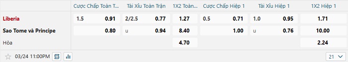 Tip kèo Châu Á hiệp 1 Liberia vs Sao Tome